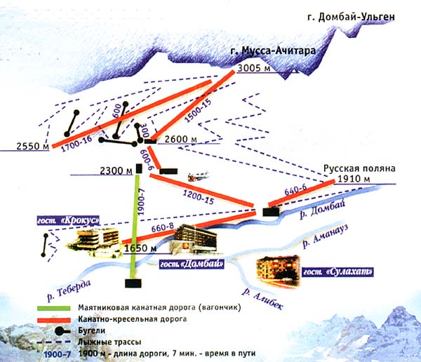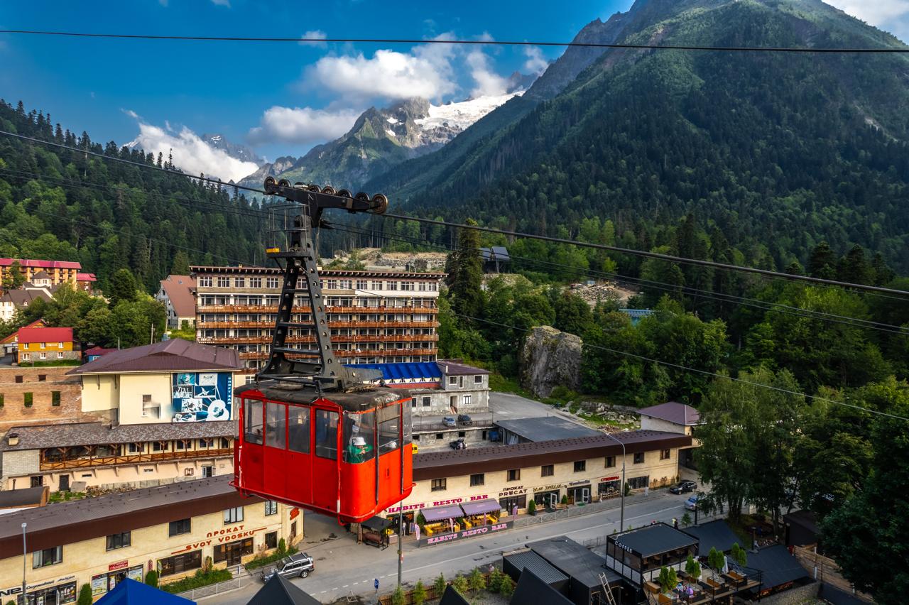 Высшая точка Домбая — гора Домбай-Ульген, величественный четырехтысячник высотой 4046 метров, расположенный на границе России и Абхазии. Общая протяженность современной системы канатных дорог превышает 5 километров. Она доставляет путешественников на вершину горы Мусса-Ачитара, на отметку 3168 метров. Подъем на канатке дарит редкую возможность увидеть смену сразу нескольких природных зон: