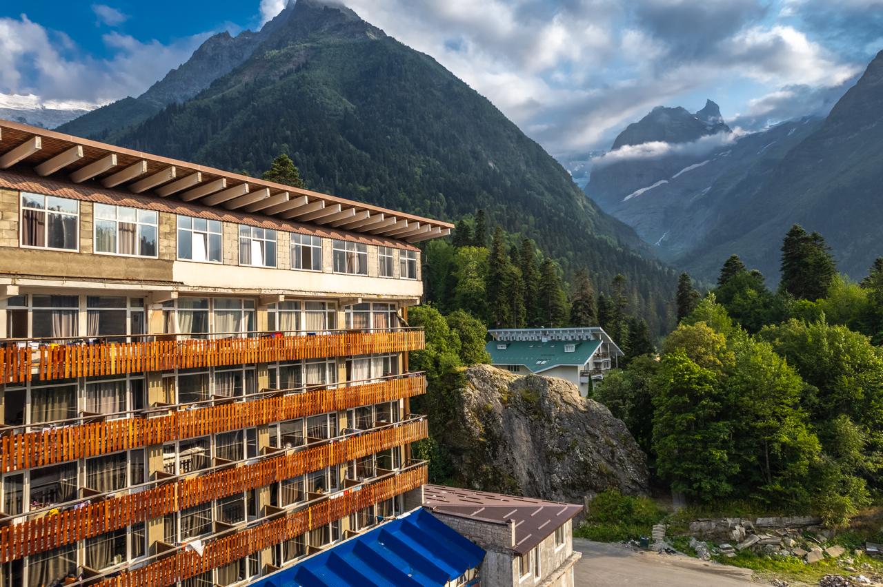«В 60-х годах XX, впервые после военных лет в Домбай снова потянулись туристы. Началось бурное строительство. Первый жилой дом заселили в 1966 г. В нем не было не отделки, ни отопления, но это вряд ли кого-то могло огорчить. Первые строители Домбая жили в палатках и землянках. В это же время начинается строительство первой большой гостиницы края.»**
