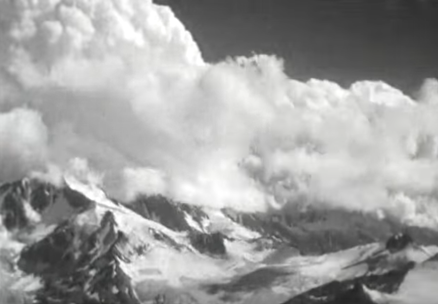 Примерно в то же время Домбай впервые появляется в кино. Премьерным опытом считается кинолента «Дети капитана Гранта» , вышедшая в свет в 1936 году. По сценарию герои картины покоряли Анды. Выезд на съемки в столь дальнюю заграницу в советские времена был затруднен, поэтому американскую и австралийскую экзотику нашли в Крыму и горах Кавказа. Так, переход через Анды снимали на Алибекском леднике Домбая. В момент тяжелого перехода Жак Панганель поёт «Капитан, капитан, улыбнитесь», пытаясь подбодрить Роберта, и прославляя оптимизм и отвагу перед лицом опасности. На фото справа кадр из фильма, слева Алибекский ледник в наши дни.