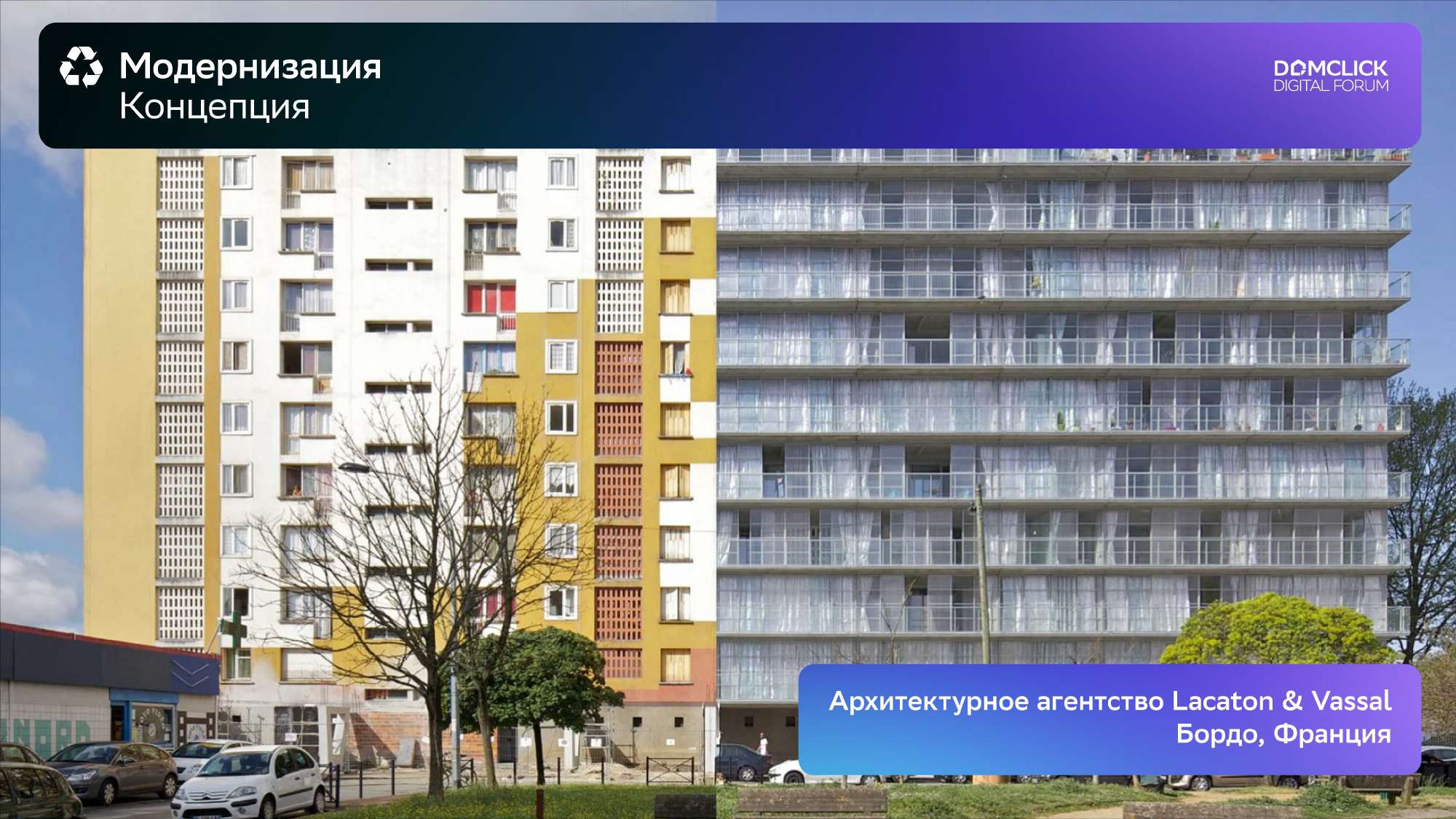1. Реализованный проект ретрофиттинга жилого массива (аналога типовых «хрущевок») демонстрирует возможности трансформации старого фонда. За счет расширения проходов и добавления глубоких террас здание получило новые стандарты комфорта. Полностью обновлены климатические системы и теплоизоляция, что превратило устаревший объект в современное энергоэффективное жилье. Это проект архитектурного бюро из Бордо.