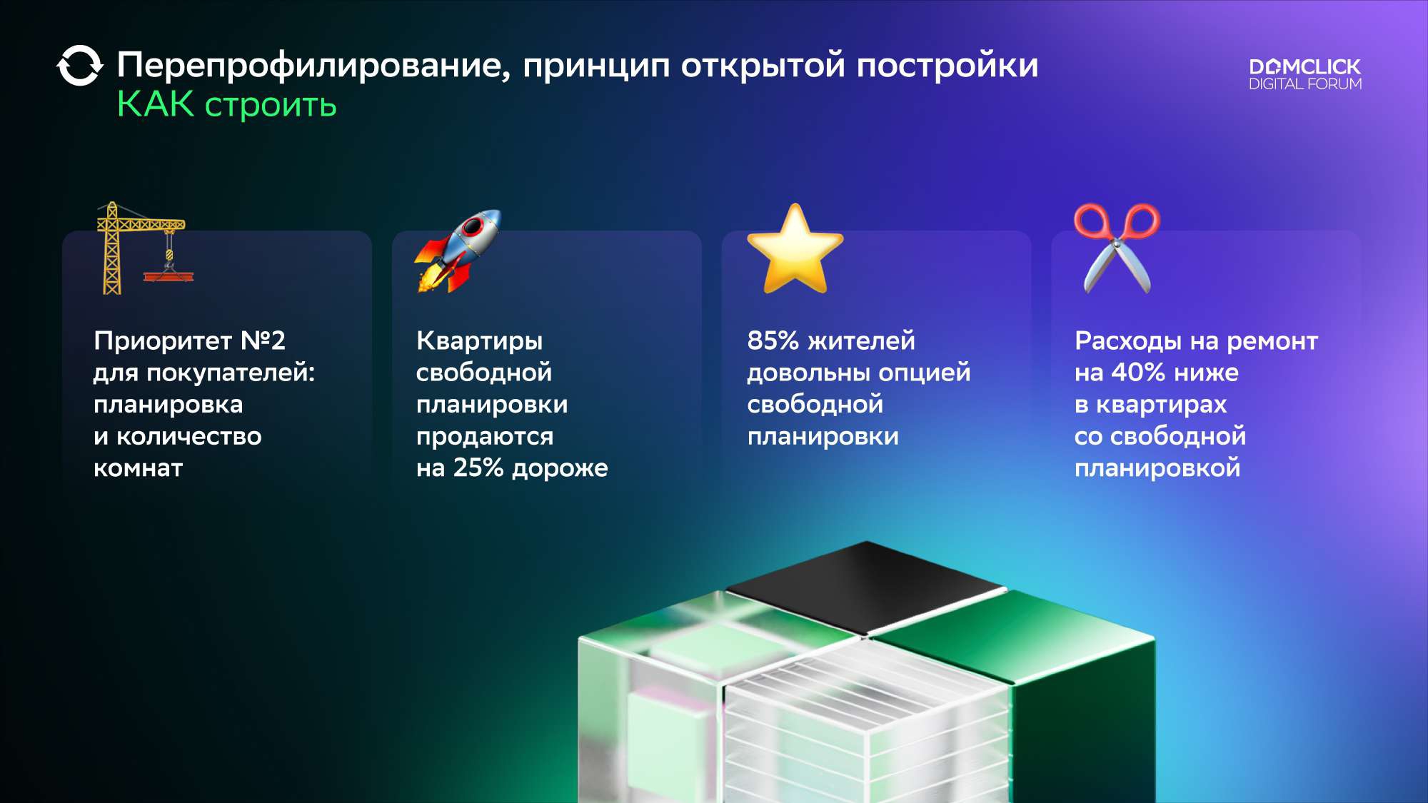 • Свободная планировка: Этот формат остается приоритетом для рынка. Квартиры open space продаются на 25% дороже типовых.