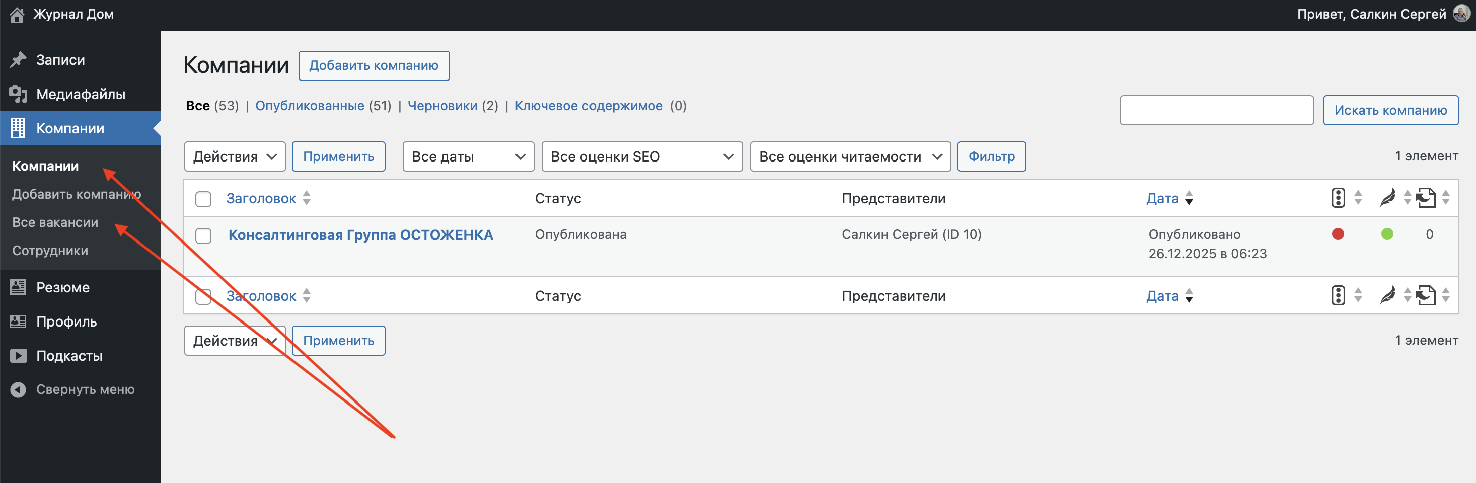 Выберете раздел «Компании» и в открывшемся списке «Все вакансии»