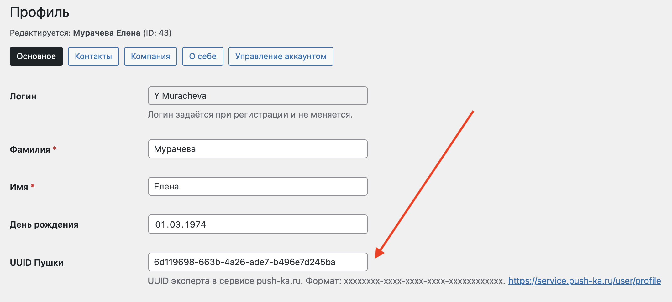 Для активации продуктового профиля требуется соединить профиль пользователя PUSH-KA и профиль Эксперта в ДОМ. Для этого вам потребуется скопировать ваш UUID в PUSHKA: