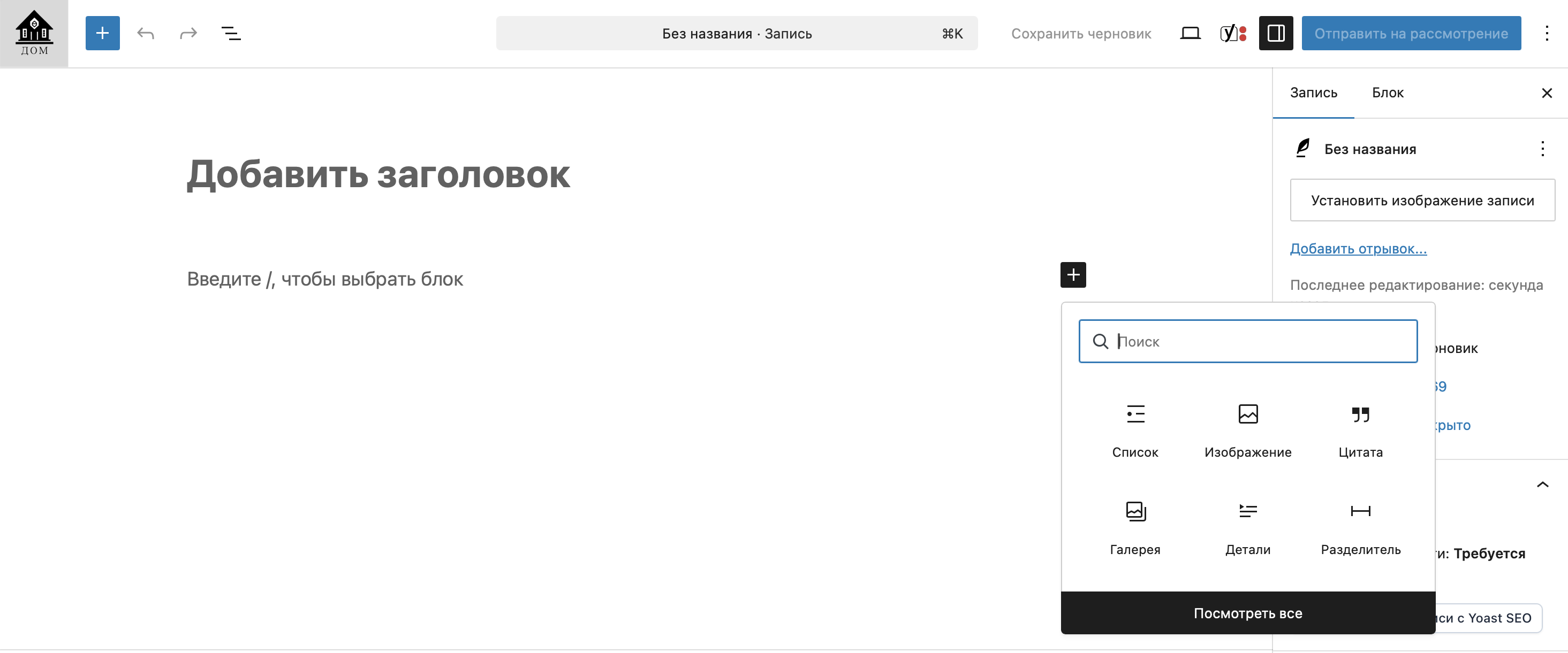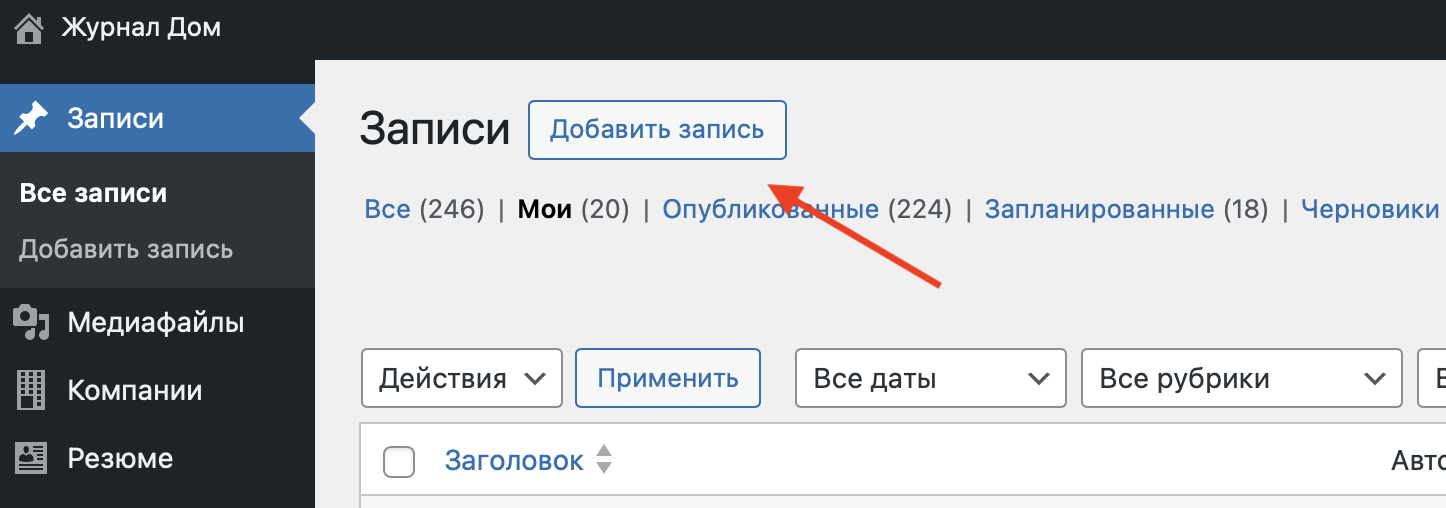 Следующим шагом активируйте через кнопку «Добавить запись» раздел формирования статьи