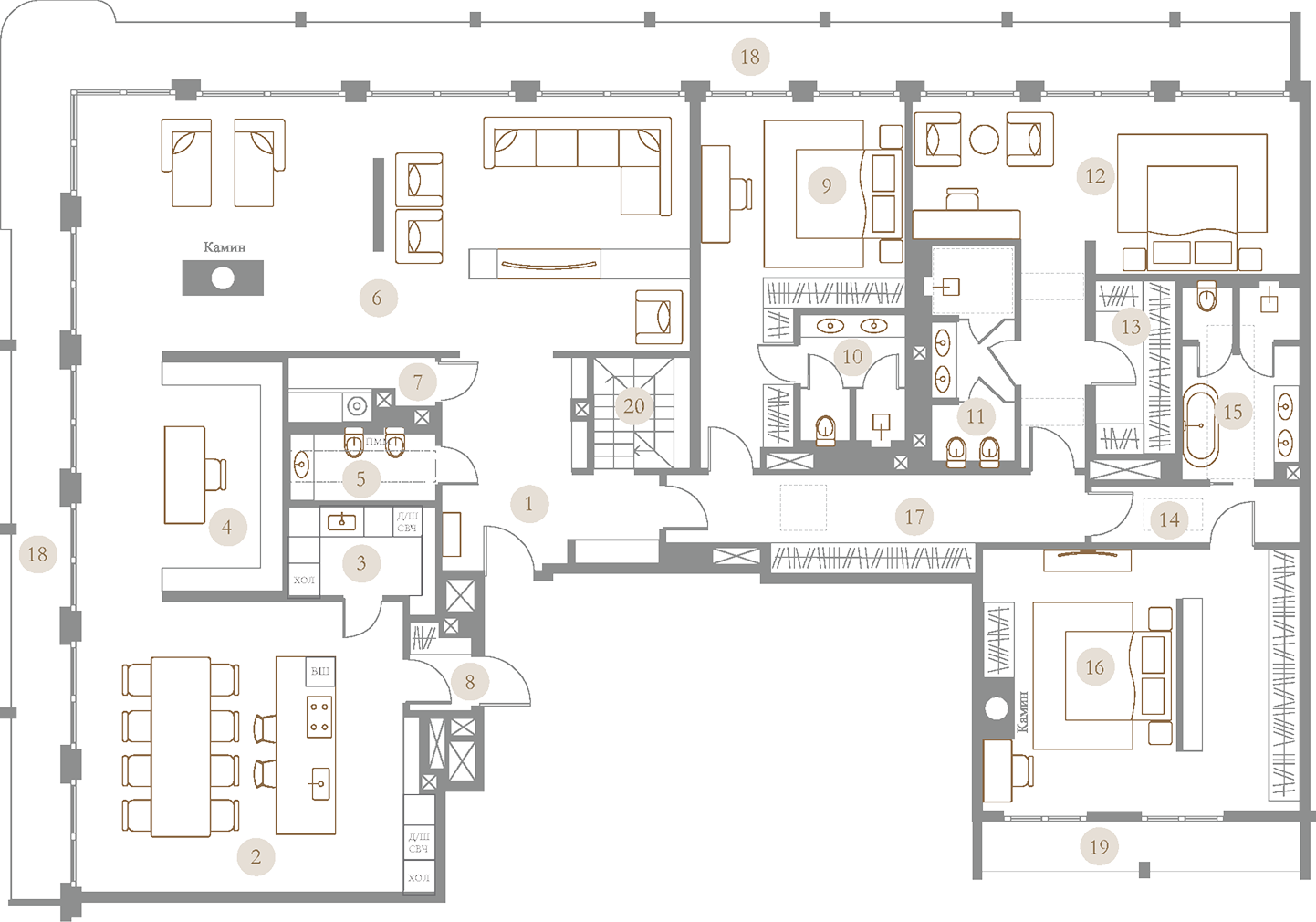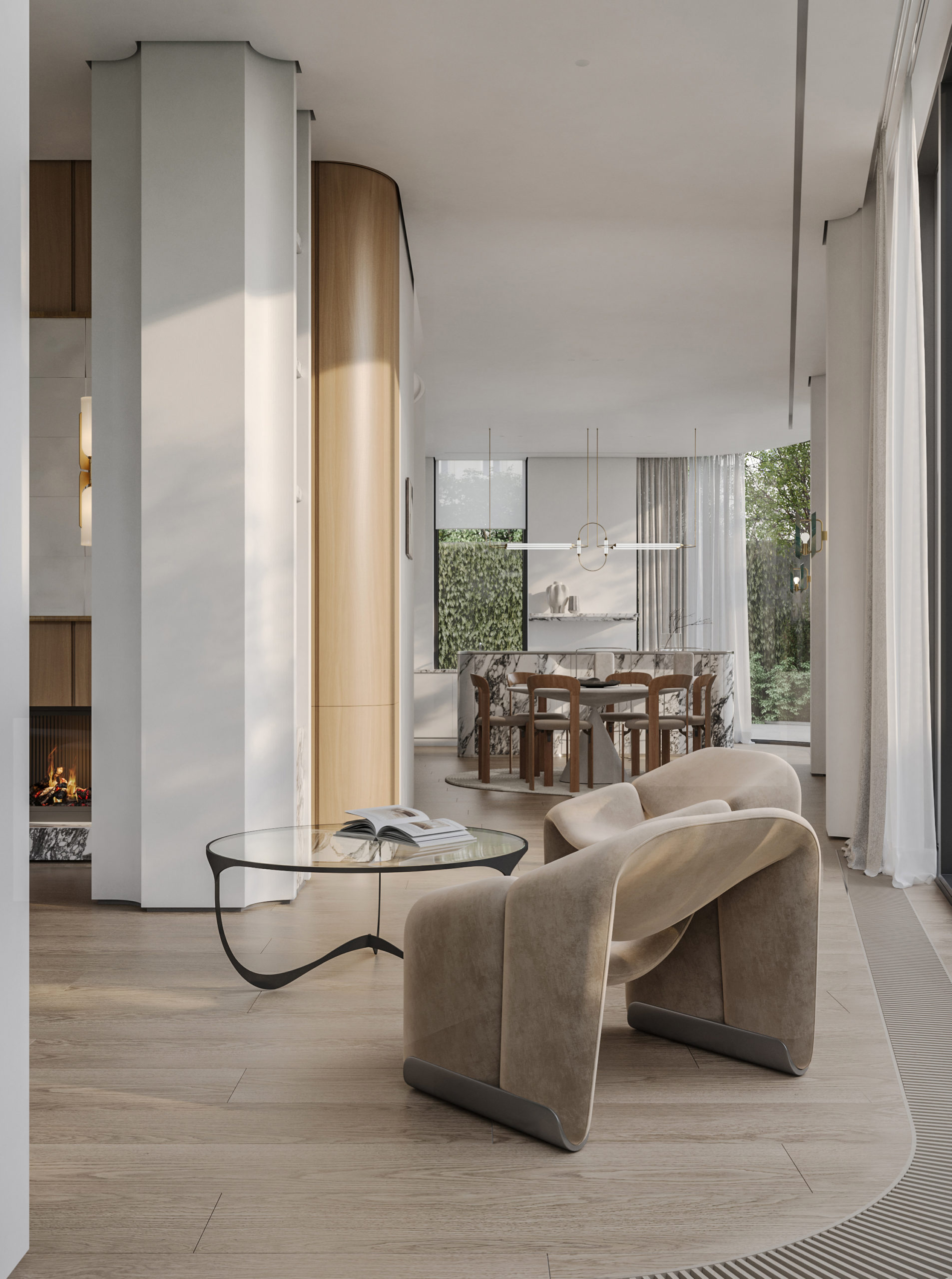 Лаврушинский — редкий формат клубной роскоши вблизи Кремля. Верхние уровни спроектированы как автономные пространства с панорамными видами, приватными террасами и исключительной степенью уединения.