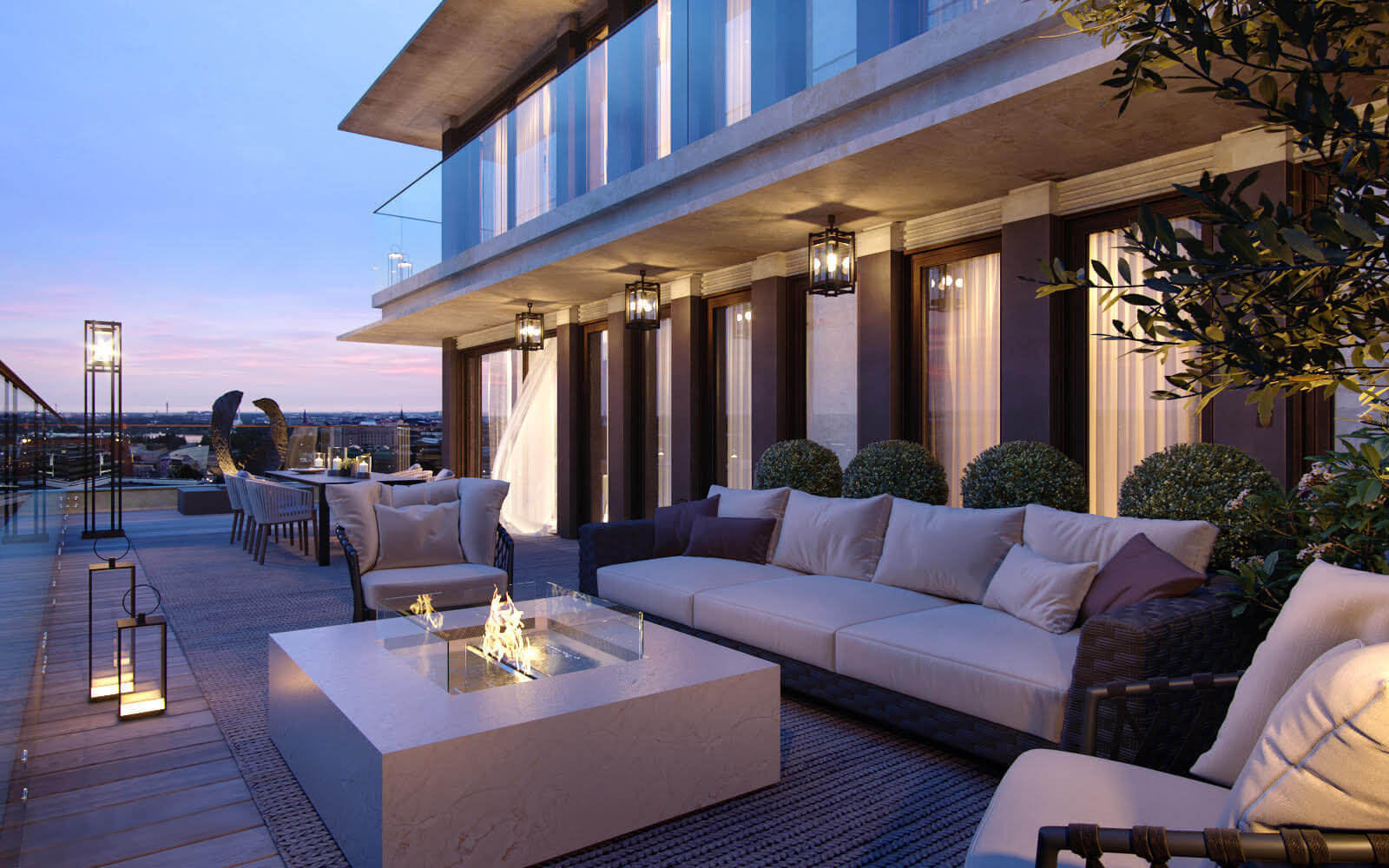 Давайте исследуем современный пентхаус — мы увидим синтез пространства и инженерной мысли: панорамное остекление во всю высоту, потолки, позволяющие дышать интерьеру, приватные террасы как продолжение гостиной и конечно, камины, возвращающие ощущение дома даже в центре мегаполиса, и персональные лифты, а также, отдельные сценарии приватности. Всё чаще пентхаус проектируется как городская вилла на крыше — автономная, камерная, отделённая от ритма улиц.