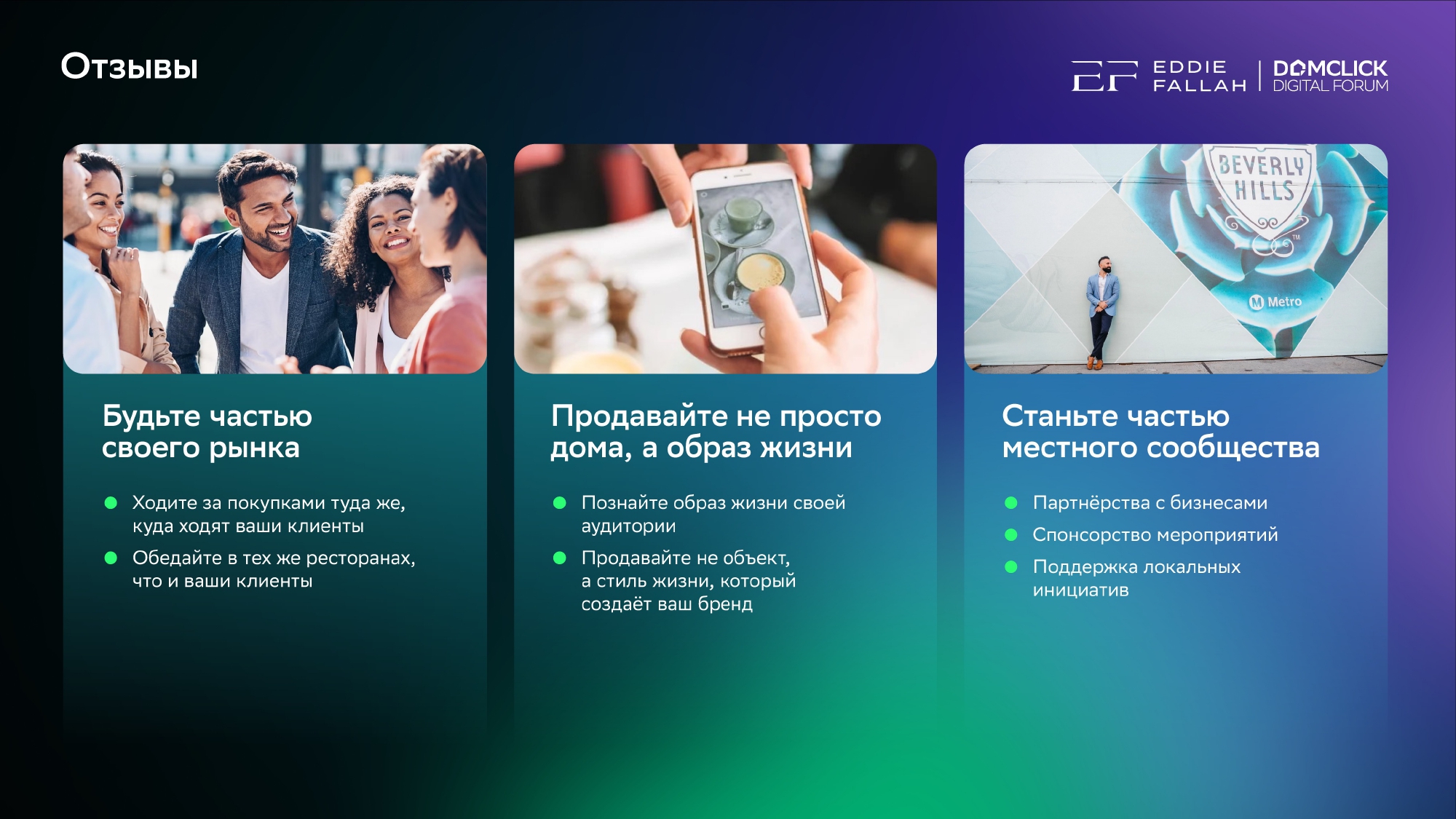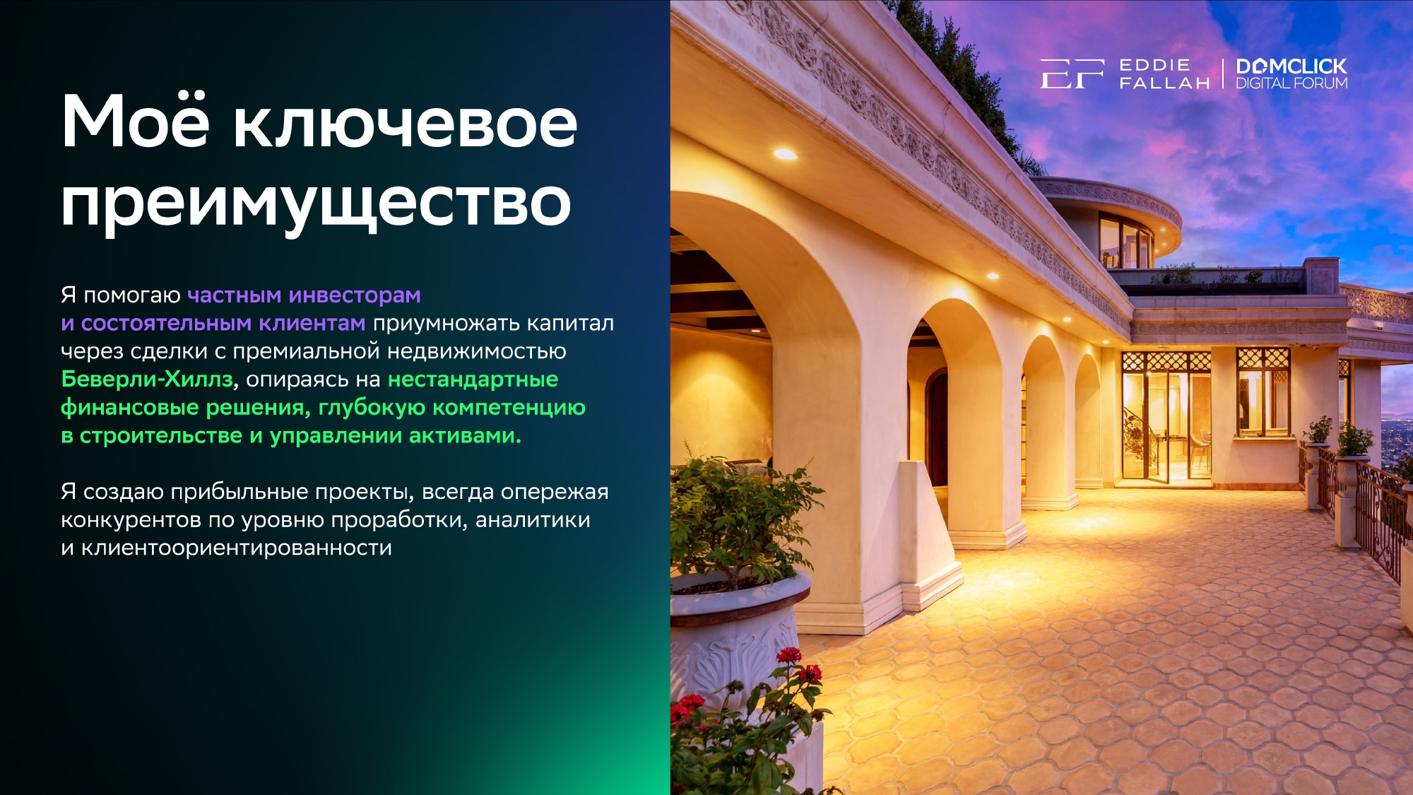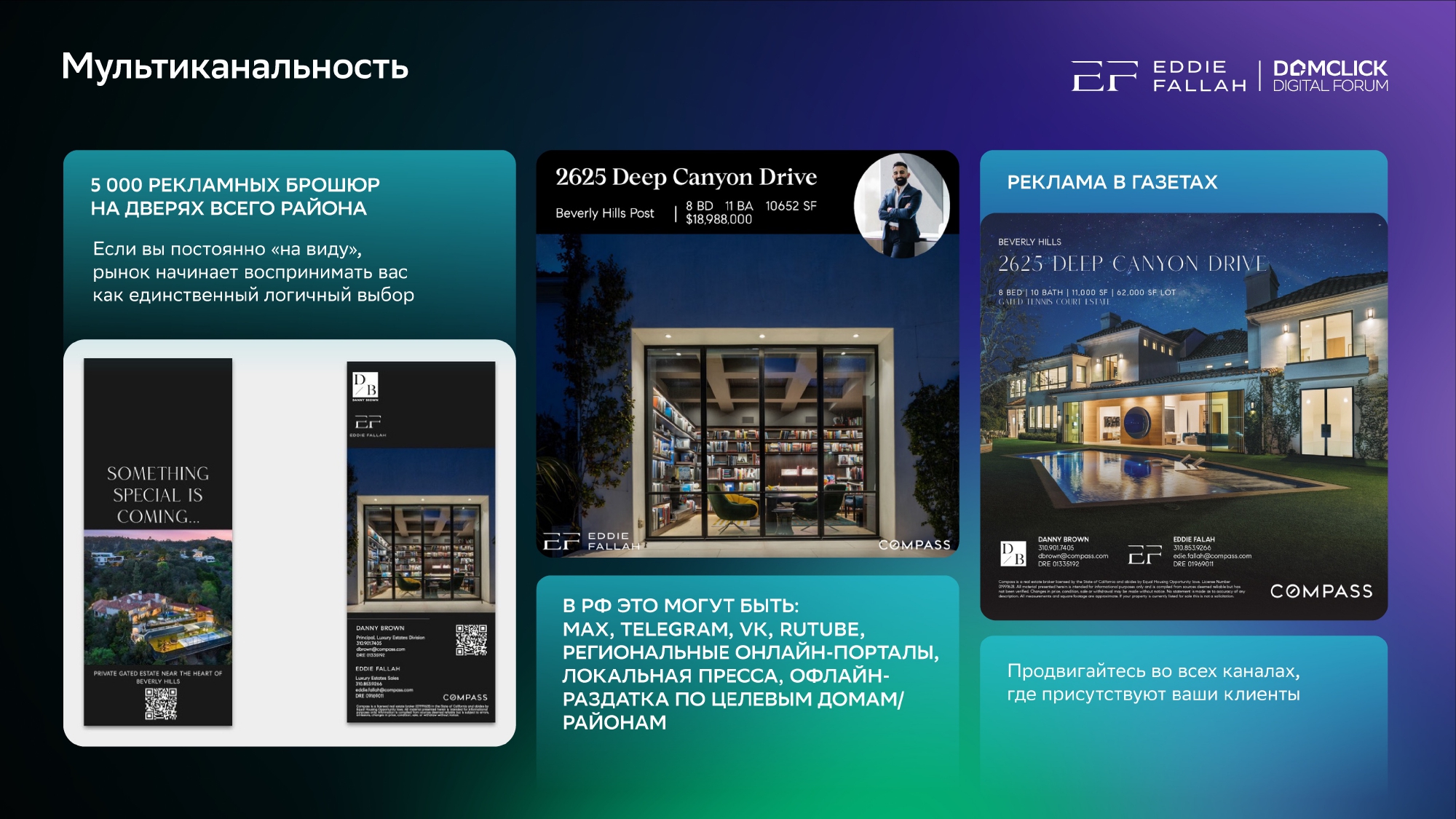 Частный риелтор и предприниматель из Лос-Анджелеса Эдди Фаллах, который продает недвижимость Тому Крузу и специализируется на домах Беверли Хиллс порядка 100 млн долларов говорит, что главный его инструмент успешных продаж — это личный бренд. Личный бренд и точка. Все остальные инструменты в премиальном сегменте давно перестали работать.