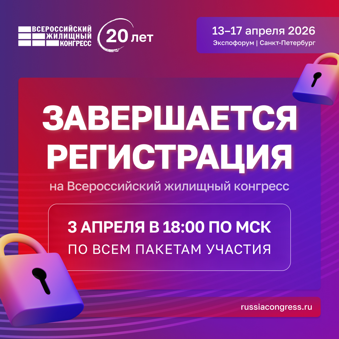 В пятницу – 3 апреля в 18:00 по мск – завершается регистрация на Всероссийский жилищный конгресс. Конгресс состоится 13–17 апреля в Санкт-Петербурге на одной из самых статусных площадок — в Экспофоруме.