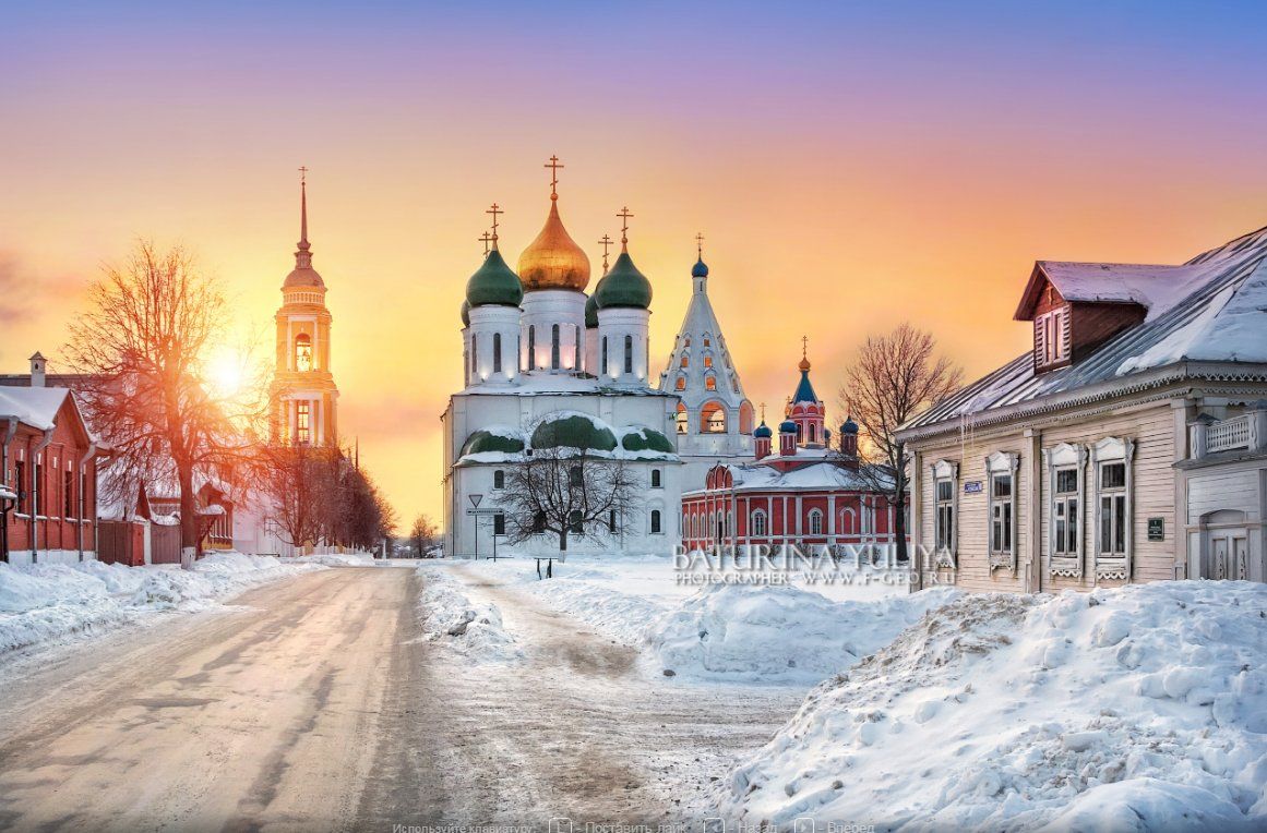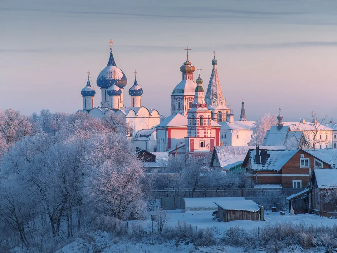 Город из Золотого кольца с заснеженными храмами, кремлём и Гостиным двором. Зимой здесь особенно атмосферно.