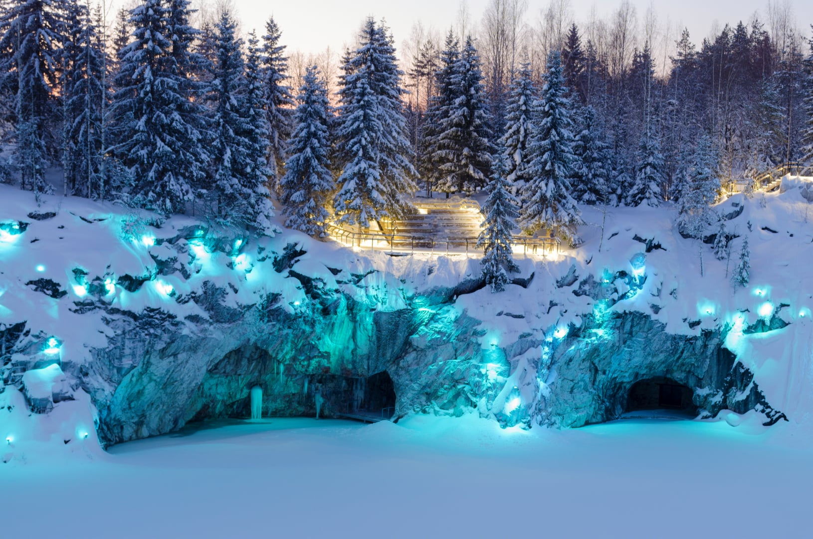 Карелия — здесь можно увидеть заснеженные водопады (например, Ахвенкоски), парк «Рускеала» с подсвеченными штольнями и замёрзшими водопадами, а также попробовать подлёдную рыбалку.